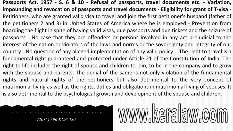 3. This Court, by interim order dated 19th December 2014 directed the third respondent to release the passport to the petitioners within a period of two weeks. Accordingly, the passports were released. Therefore, the only surviving question is whether the petitioners be permitted to go abroad to join the first petitioner's husband (father of petitioners 2 and 3) who is now in United States of America.
